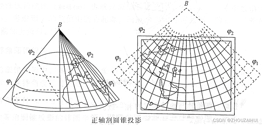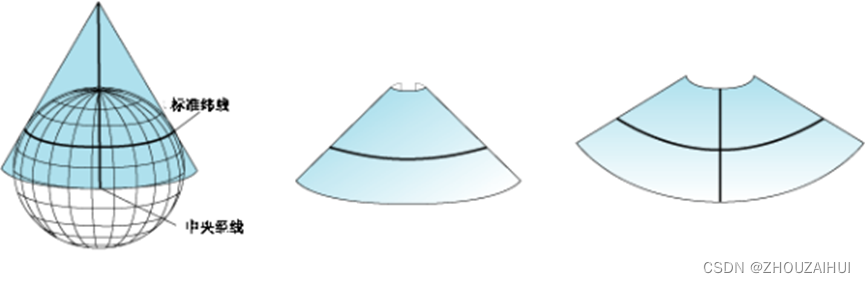 圆锥被置于地球上。圆锥和地球沿一条纬线相交。该纬线就是标准纬线。沿中央子午线对面的经线切开圆锥,并将其展平为平面。