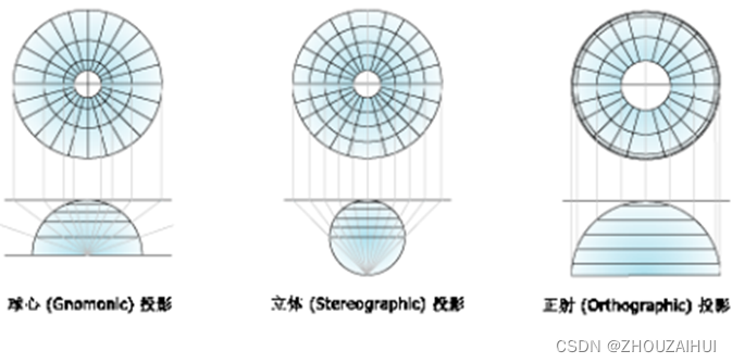 方位投影或平面投影可具有不同的透视点。球心投影的透视点位于地球的中心。与接触点相对的地球另一侧用来进行立体投影。正射投影的透视点位于无限远处。