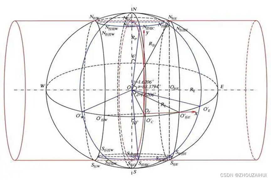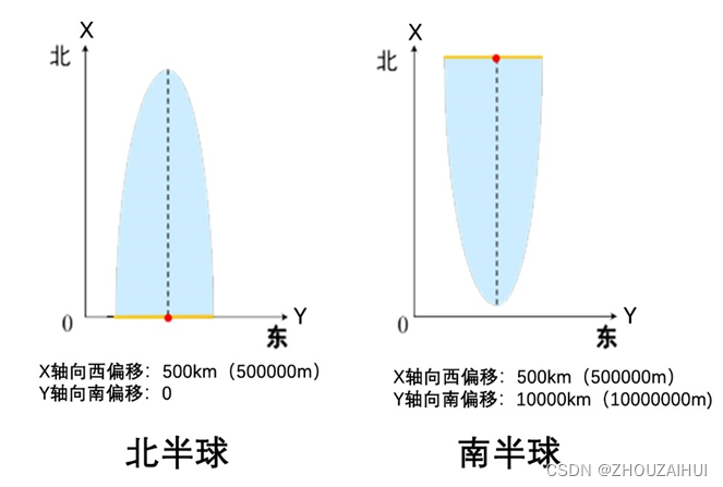 将中央子午线向西偏移500km做平行线,平行线与赤道的交点定义为新的坐标原点O(0,0),坐标系X、Y轴轴向保持不变。