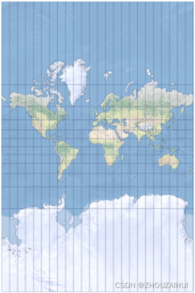 墨卡托投影,是正轴等角圆柱投影。由荷兰地图学家墨卡托(Gerardus Mercator)于1569年创立。假想一个与地轴方向一致的圆柱切或割于地球,按等角条件,将经纬网投影到圆柱面上,将圆柱面展为平面后,即得本投影。墨卡托投影在切圆柱投影与割圆柱投影中,最早也是最常用的是切圆柱投影。