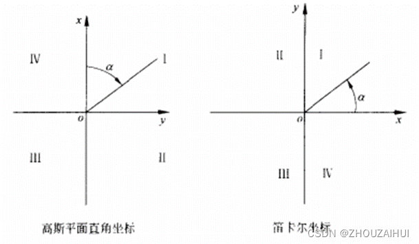 (3)坐标象限不同。高斯平面直角坐标以北东为第一象限,顺时针划分为四个象限;笛卡尔坐标也是以北东为第一象限,逆时针划分为四个象限。