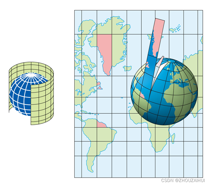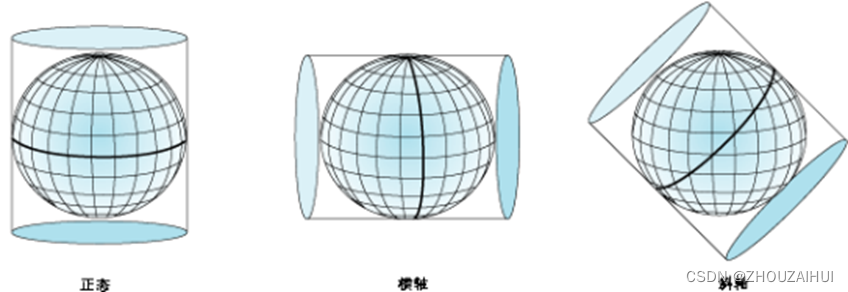 圆柱被置于地球上。圆柱可沿一条纬线(正常情况)、一条经线(横轴情况)或其他线(斜轴情况)接触地球。