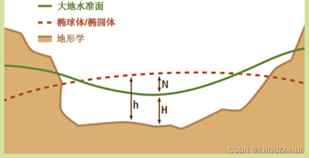 绿色线代表大地水准面。曲线大致遵循地形的走向。虚线代表椭圆体的表面。h 是高出椭球体或椭圆体的高度 ( HAE )。在本例中,高度是负值。N 代表大地水准面波动,它是椭圆体表面与大地水准面之间的距离。H 代表正高,它与椭圆体高度的关系:h = H + N