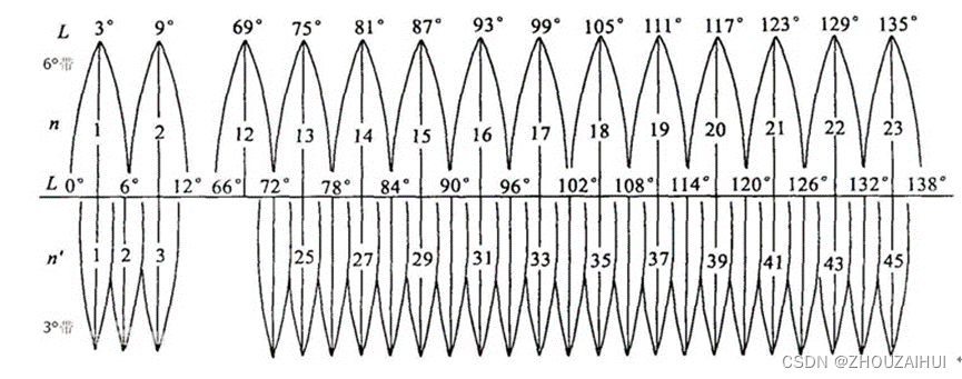 起始于初子午线(格林威治),按经差6度为一个投影带自西向东划分,全球共分60个投影带。我国范围可分成11个6度带(13-23)。
