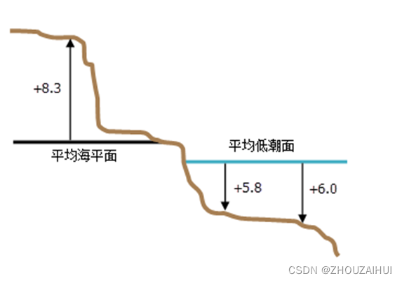 测量单位可能是高程坐标系最重要的部分。测量单位始终是线性的(例如,国际英尺或米)。另一个重要部分是 z 值究竟代表高度(高程)还是深度。对于每种类型,z 轴方向分别为正“北”或正“南”。下图显示了两个垂直坐标系:平均海平面和平均低潮面。平均海平面用作高度值的零水平面。平均低潮面则是基于深度的垂直坐标系。