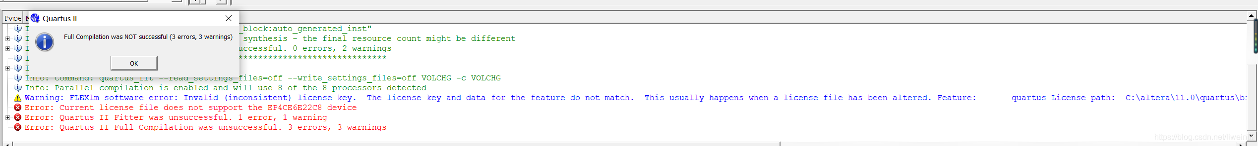 Warning: FLEXlm software error: Invalid (inconsistent) license key.  The license key and data for the feature do not match.  This usually happens when a license file has been altered. Feature:       quartus License path:  C:\altera\11.0\quartus\bin\license.dat; FLEXnet Licensing error:-8,523 For further information, refer to the FLEXnet Licensing documentation, available at "www.acresso.com".Error: Current license file does not support the EP4CE6E22C8 deviceError: Quartus II Fitter was unsuccessful. 1 error, 1 warning	Error: Peak virtual memory: 317 megabytes	Error: Processing ended: Mon Aug 10 23:39:58 2020	Error: Elapsed time: 00:00:01	Error: Total CPU time (on all processors): 00:00:00Error: Quartus II Full Compilation was unsuccessful. 3 errors, 3 warnings