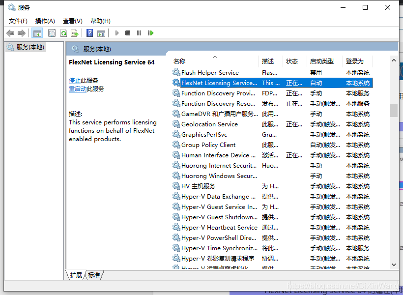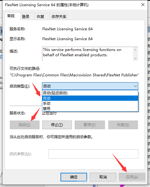 打开【服务】对话框,找到 FlexNet licensing service,如果是禁用的就启用。 在启动类型中选择【自动】,点【应用】