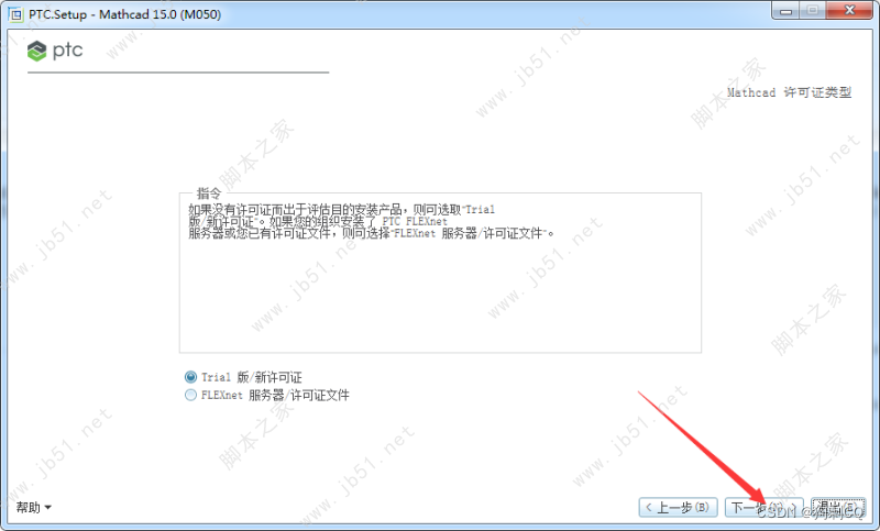 6、选择Mathcad许可证类型:如果没有许可证而出于评估目的安装产品,则可选取“Trial 版/新许可证”;如果您的组织安装了 PTC FLEXnet 服务器或您已有许可证文件,则可选择“FLEXnet 服务器/许可证文件”;
