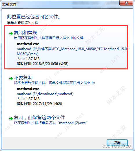 15、在下载的文件夹内,找到 Crack 文件夹下的 mathcad.exe 破解补丁,并将 mathcad.exe破解补丁 复制到 刚才打开的mathcad 15安装根目录 进行覆盖