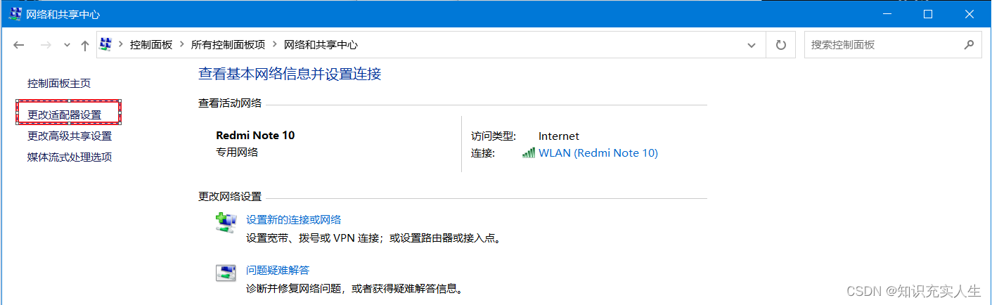电脑出现了多网卡(包含虚拟网卡),查看自己的网卡(window10系统),进入“ 控制 面板-》网络和共享中心-》更改适配器设置”。