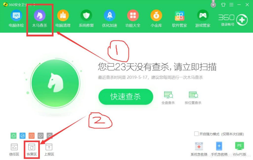 然后又有人说是360把一个SW文件删除了,要去360安全卫士里找到(木马查杀)---(恢复区)