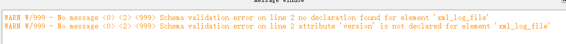 WARN W/999 - No message <0> <2> <999> Schema validation error on line 2 no declaration found for element 'xml_log_file'