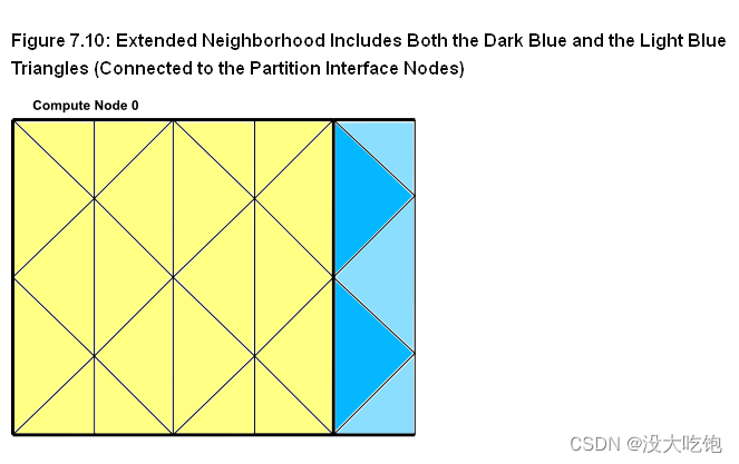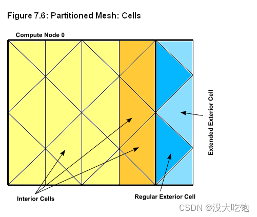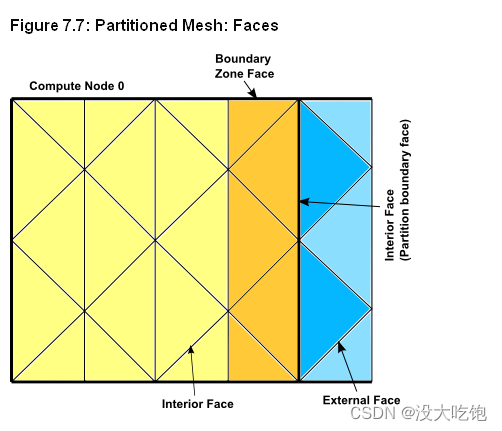 分区网格中大致有两种类型的单元:内部单元和外部单元(interior cells and exterior cells)(图7.6)。内部单元(interior cells)完全包含在网格分区中。分区的外部单元(exterior cells)不包含在该网格分区内,而是连接到其与一个或多个相邻分区的接口上的节点。如果外部单元与内部单元共享一个面,则将其称为常规外部单元(regular exterior cell)。如果外部单元仅与内部单元共享一条边或一个节点,则将其称为扩展外部单元(extended exterior cell)。
