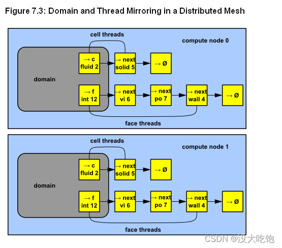 计算节点在其网格部分上存储和执行计算,而沿分区 边界 的单层重叠单元提供跨分区边界的通信和连续性(图7.2:分布在两个计算节点之间的分区网格)。即使单元和面是分区的,网格中的所有域和线程(domains and threads)都在每个计算节点上 镜像 (图7.3:分布式网格中的域和线程镜像)。线程存储为链表(The threads are stored as linked lists as in the serial solver.),与串行解算器一样。计算节点可以在大规模并行计算机、多CPU工作站或使用相同或不同操作系统的工作站网络上实现。