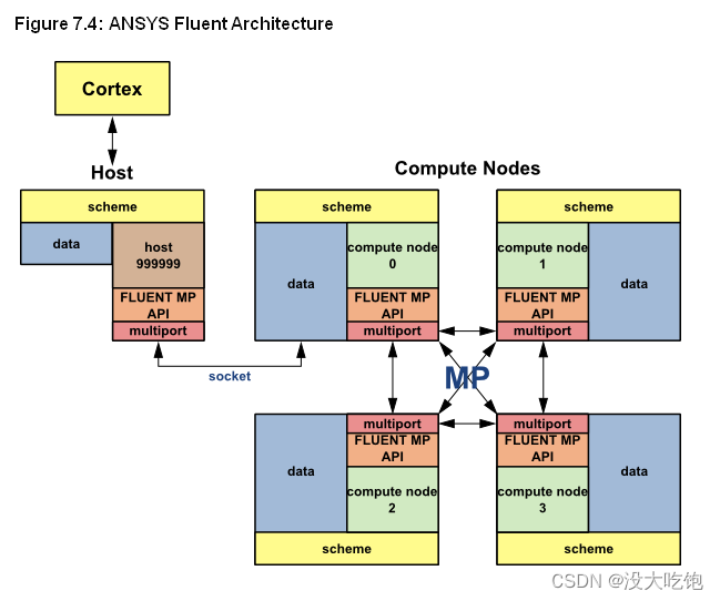 ANSYS Fluent会话中涉及的进程由Cortex、主机进程(host)和一组n个计算节点(node)进程(称为node)定义,计算节点标记为 0 到 n-1 (图7.4:ANSYS Fluent架构)。主机从Cortex接收命令,并将命令传递给compute node-0。compute node-0 反过来将命令发送给所有其他计算节点。所有计算节点(0除外)都从compute node-0接收命令。在计算节点将消息传递给主机(通过compute node-0)之前,它们彼此同步。