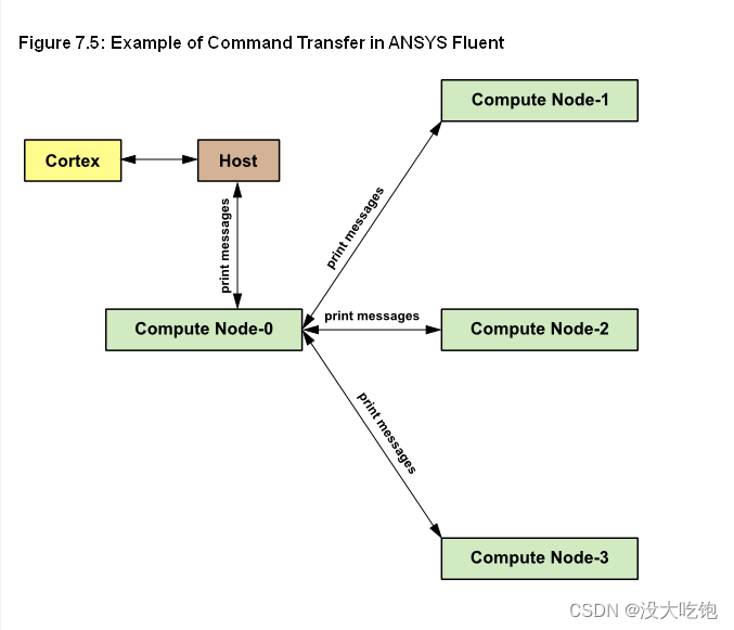 所有ANSYS Fluent进程(包括主机进程)都由唯一的整数ID标识。主机进程被分配ID host(=999999)。主机从compute node-0收集消息,并对所有数据执行操作(如打印、显示消息和写入文件)(见图7.5:ANSYS Fluent中的命令传输示例)。