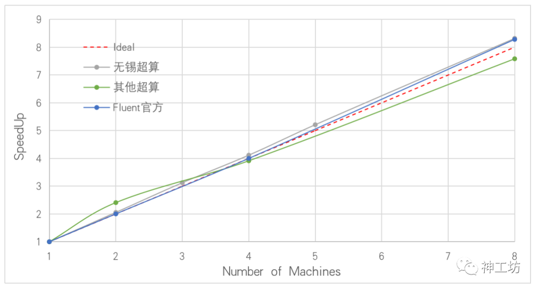 将case2的测试结果与Fluent官方及第三方超算测试情况进行对比,结果如下图所示: