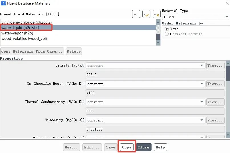 单击Fluent Database,找到water-liquid,点击copy,即可添加water材料