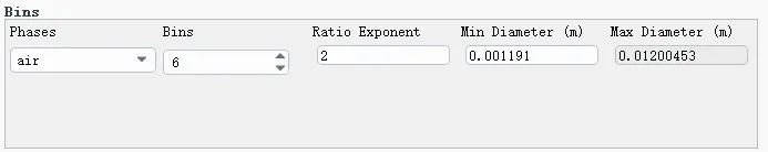 Bins栏的phase为次相。bins表示的是颗粒粒径分了多少段,数值为几表示分了几段。Ratio Exponent表示的是颗粒体积等比系数。本案例粒径为气泡直径