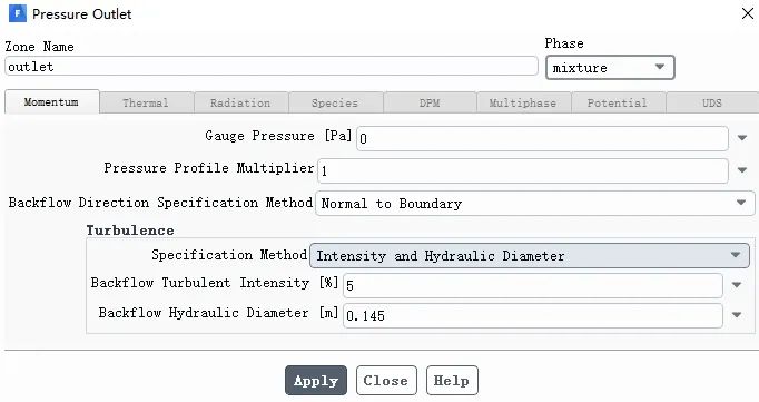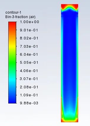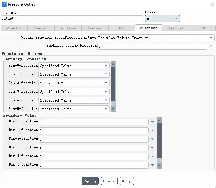 空气相:出口也认为气泡等直径为3毫米,出口空气相回流体积分数为1,指定Bin-3-fraction为1。Bin3刚好是颗粒粒径为0.003m