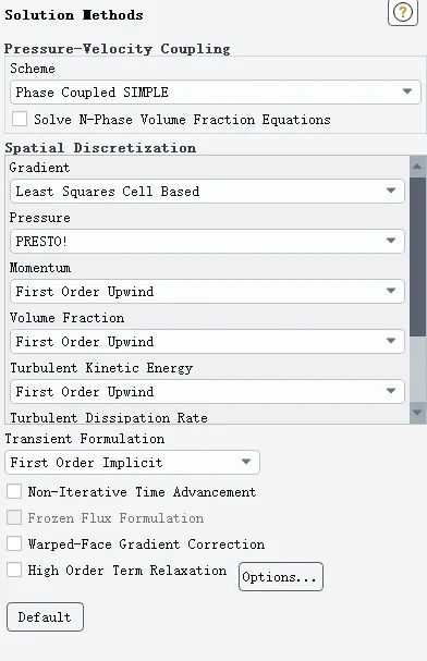 PBM方程默认离散格式的求解精度是 First Order Upwind,亚松驰因子是0.5。保持默认即可