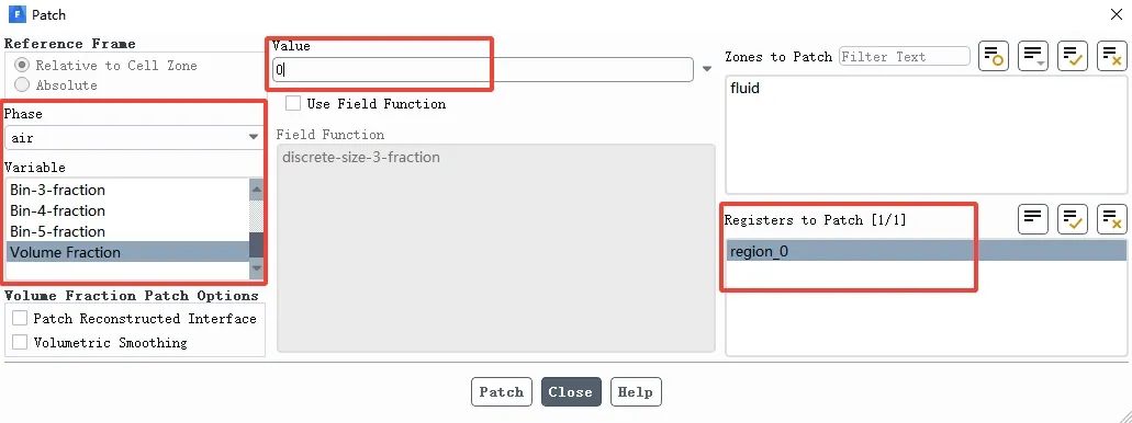 按上图设置,Phase选择air,Variable选择Volume Fraction,Value输入0, Registers to Patch选择刚才标记的区域region-0。注意,不要选择surface。单击patch。此时计算域下半部分为液相区。