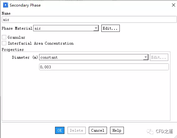 此处不必指定直径,在后面的PBM模型的设置中,也会指定颗粒粒径的分布,最终用sauter-mean粒径会覆盖掉此处指定的值。