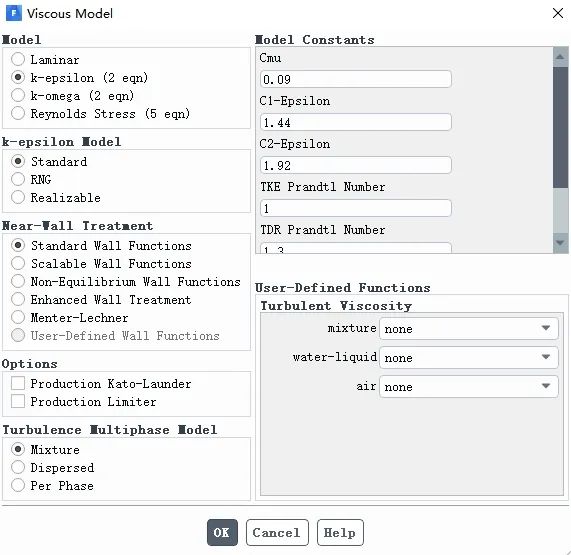 打开欧拉模型,Number of Eulerian Phase设置为2,表示两相流