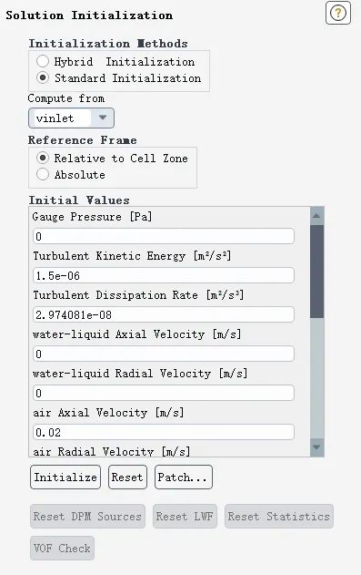 注:这里需要注意,由于Compute from选择vinlet,初始化空气的体积分数为1,因此需要将模型下标区域patch为水。