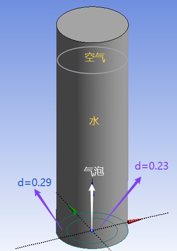 模型很简单,为二维旋转对称图形,直径为0.29m。模型下部为水,下部入口处有0.23m的区域有空气泡以0.02m/s的速度向上流动。气泡初始为等直径为3毫米,在鼓泡塔中会进行破碎长大等,因此在鼓泡塔中的直径不同。同时模型的上方会有一部分空气,并没有被水填充满。出口也认为气泡等直径为3毫米