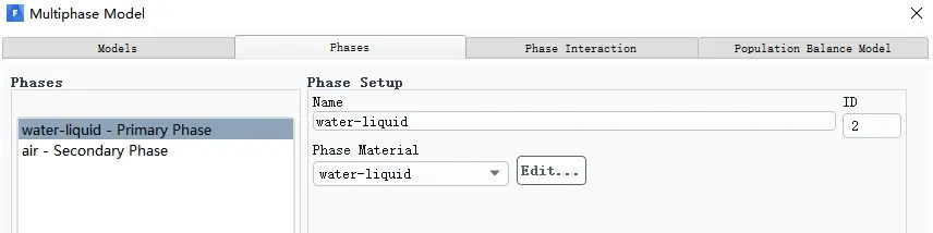 设置液态水water为主相,空气为次相,并分别在Name处改名。