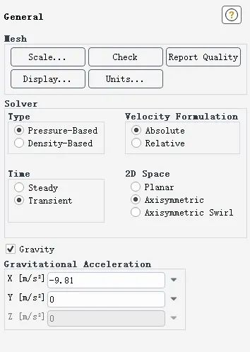 基于压力求解器,瞬态设置,勾选重力,设置重力加速度为X轴-9.81,2D Space勾选Axisymmetric,可参考文章十四.FLUENT中2D Space设置