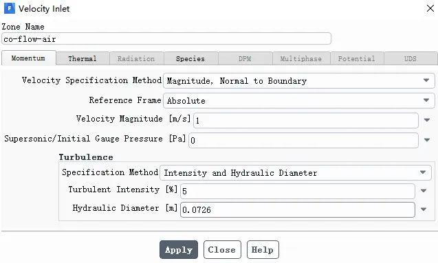 选择co-flow-air,将边界类型改为速度入口Velocity inlet,双击co-flow-air边界,弹出如下界面