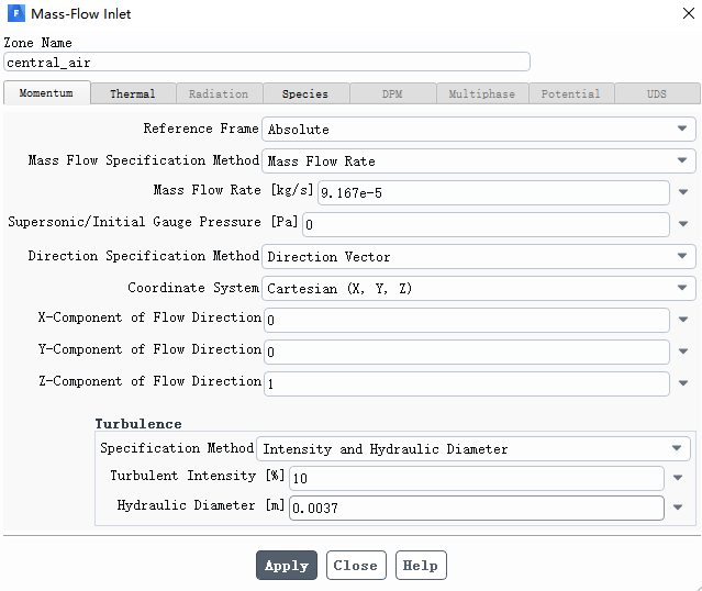 选择central_air,将边界类型改为质量流量入口mass flow inlet,双击central_air边界,弹出如下界面