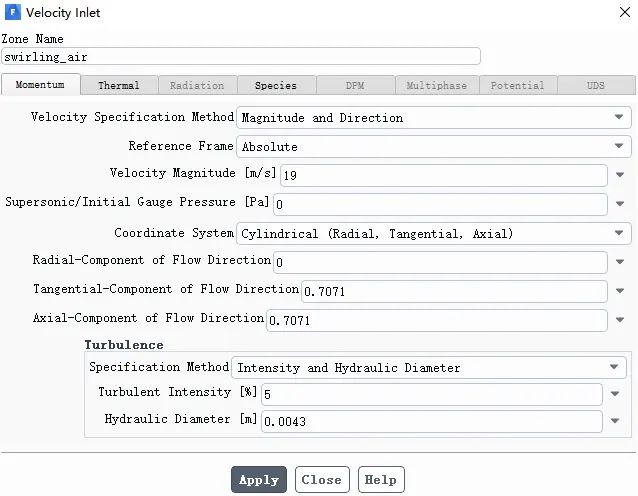 选择swirling_air,将边界类型改为速度入口Velocity inlet,双击swirling_air边界,弹出如下界面