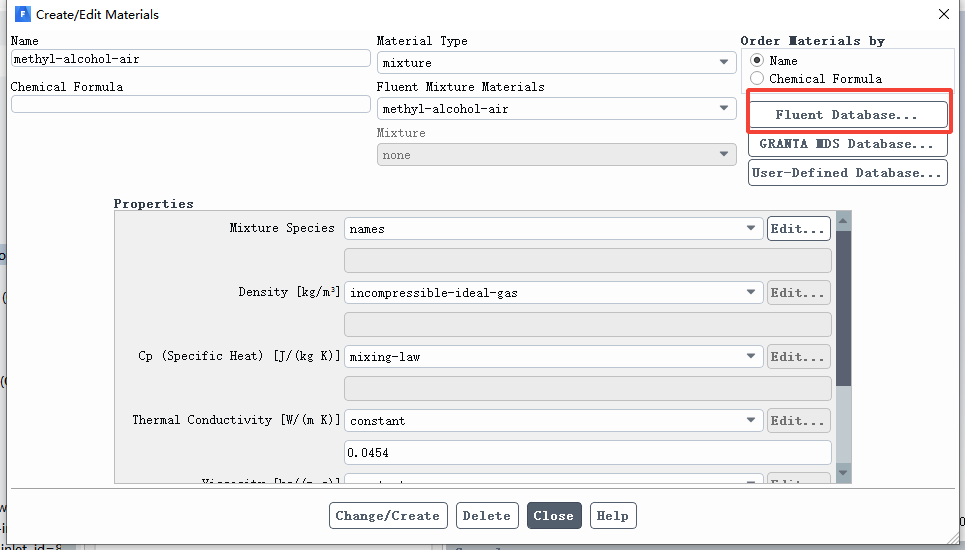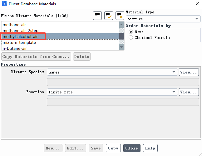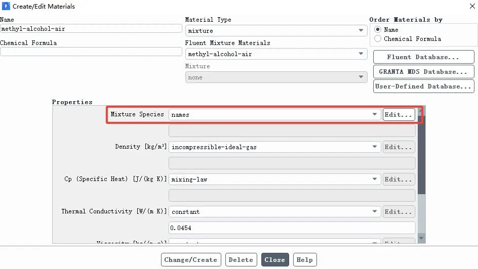 单击copy后,回到methyl-alcohol-air属性设置界面。单击Mixture Species后的Edit