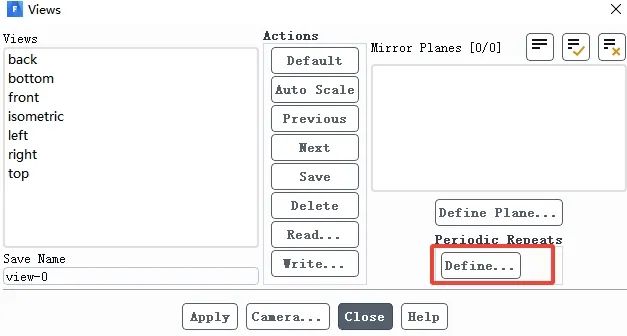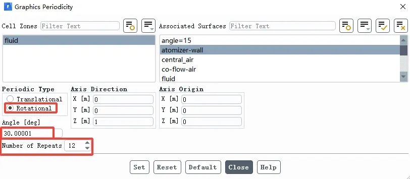注:这部分的设置主要是显示周期性网格,从Associated Surfaces中选择某些面表示对这些面进行周期性显示,Periodic Type 选择 Rotational 表示旋转周期,Number of Repeats设置为12表示显示12个周期,由于模型只有30°,因此12个周期为一个完整的圆。