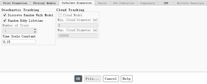 勾选Discrete Random Walk Model和Random Eddy Lifetime,这些模型将考虑液滴的湍流扩散