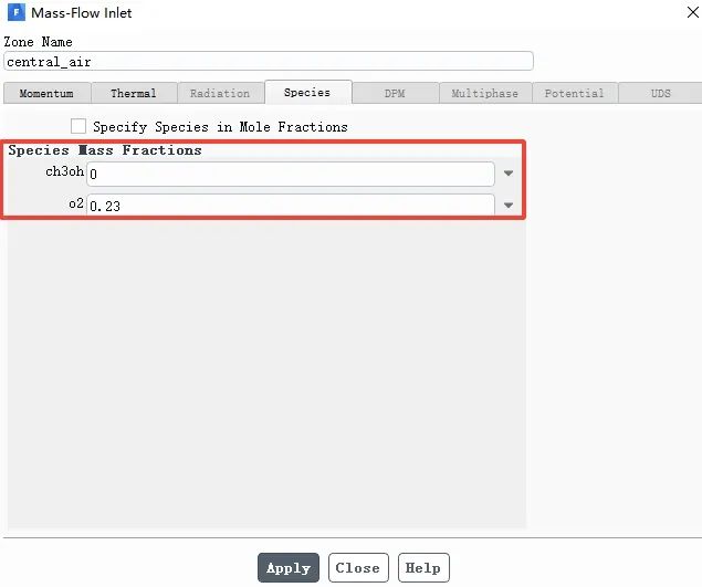 单击Species 栏,在Species Mass Fractions o2栏输入组分质量分数为0.23