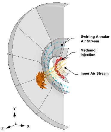本案例模拟甲醇在鼓风雾化器中的雾化,甲醇在被引入鼓风雾化器之前被冷却到-10℃。雾化器中有一股环形旋转的气流。同时为了简化模型,本模型使用了旋转周期性网格,只画了1/12即30°的模型。