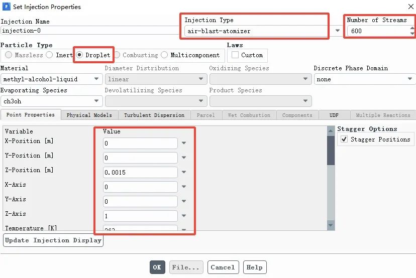 Number of Streams:输入600,表示每个时间步有600个液滴颗粒喷射进计算域
