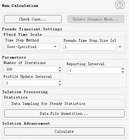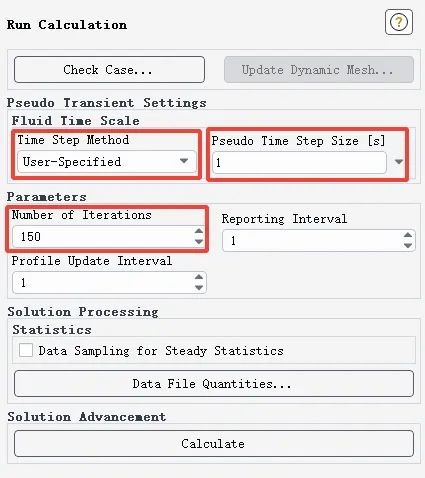 Time Step Method 设置为User-Specified 用户自定义,伪时间步长Pseudo Time Step Size设置为1s,迭代次数设置为150步