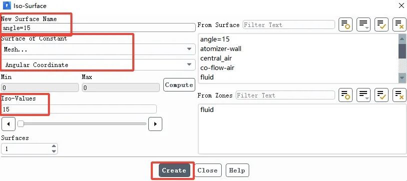 New Surface Name:输入新建面的名称为angle=15 .
