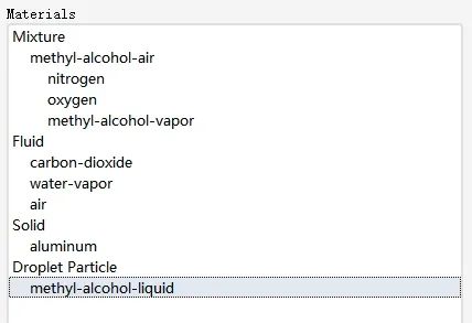 注:默认情况下这里的材料为mixture-template,想要出现methyl-alcohol-air需要在material面板下进行设置。设置好后此处才可选择methyl-alcohol-air