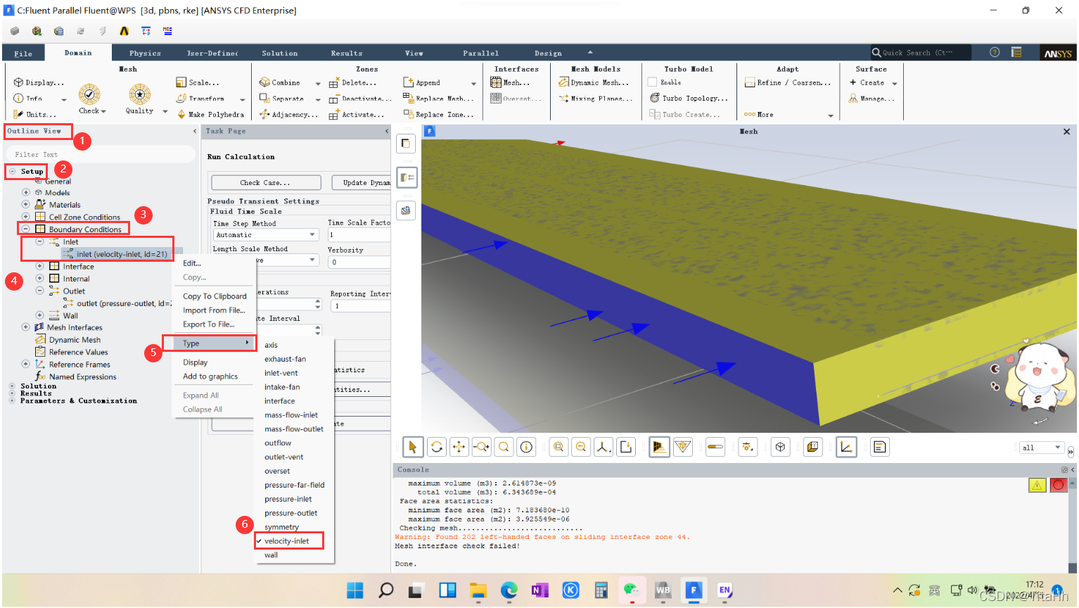 将做好的网格导入Fluent之后,在左侧的“Outline Vie”栏中找到“ Setup ——Boundary Conditions——要定义的入口边界,小编这里是【Inlet——Inlet(velocity-inlet,id=21)】”,右击“Inlet(velocity-inlet,id=21)”,在下拉栏中找到“Type”,在“Type”中选择“velocity-inlet”。