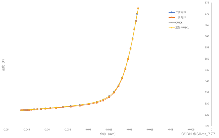 本次模拟采取了四种对流项离散格式分别对改算例进行模拟:一阶迎风、二阶迎风、QUICK、三阶MUSCL,以下是用这四种离散格式计算得到的下界面处温度分布。
