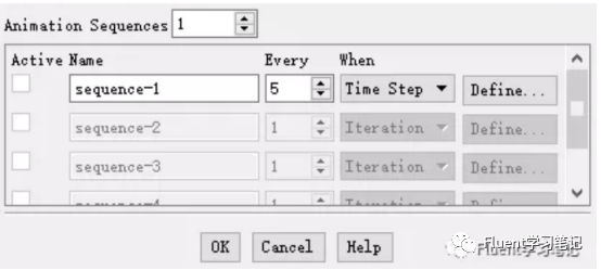9. 动画设置,只有在初始化之后,才能进行动画设置。所谓动画,其实是将很多图片拼接在一起。最上面一栏是动画的个数,中间的数字5,表示5个单位一张图片,后面的Time Step表示以时间步作为一个单位,也可以以迭代步作为一个单位。