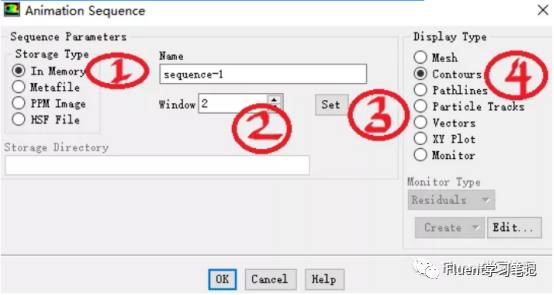 10. 单击Solution Animations界面的define按钮,按照如图所示操作。左边的Storage Type 是存储方式,In memory表示在内存中存储,这样生成的图片不会占用硬盘空间,但会占用内存,且不能保存。中间的window表示窗口2.