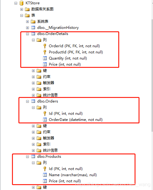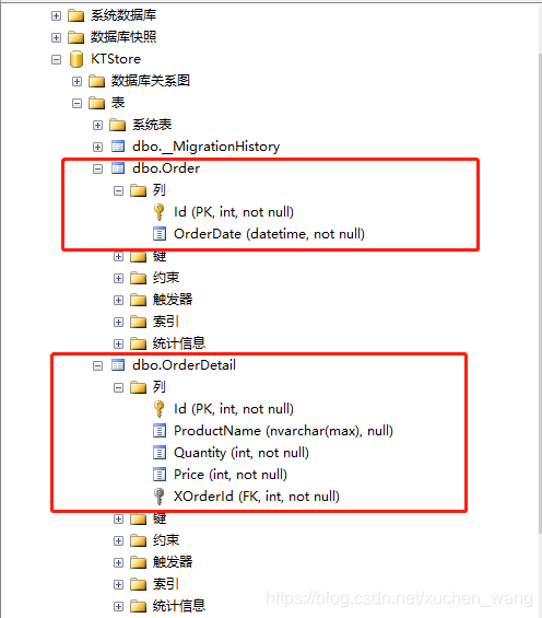 modelBuilder.Entity<Order>() .HasMany(o => o.OrderDetail) .WithRequired(od => od.Order) .HasForeignKey(od => od.XOrderId);运行后建立的数据库表结构如下图所示:
