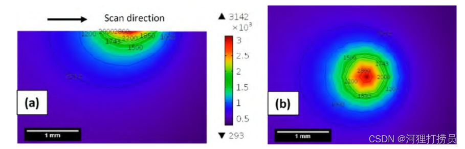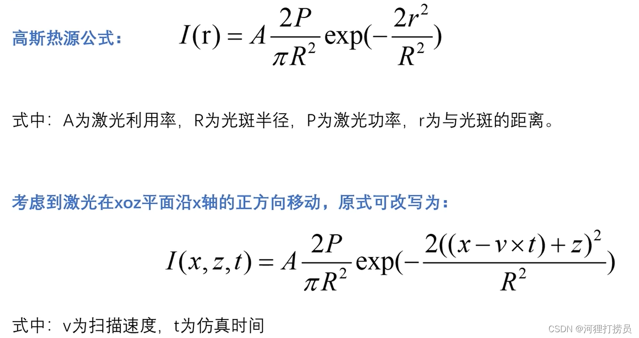 #include"udf.h"DEFINE_PROFILE(heat,t,i) { real xc[ND_ND]; real x,y,z,P,A,R,v,pi; face_t f; pi=3.141592; A=0.2; //利用率 P=1000; //激光功率 R=0.001; //光斑半径 v=0.005; //扫描速度 begin_f_loop(f,t); { real time=RP_Get_Real(“flow-time”); //获取仿真时间 F_CENTROID(xc,f,t); //获取坐标 x=xc[0]; y=xc[1]; z=xc[2]; F_PROFILE(f,t,i)=(A*2*P)/(pi*R*R)*exp(-2*(pow(x-v*time,2)+z*z)/(R*R)); } end_f_loop(f,t)}接下来逐一细致讲解,以便能根据自己的所需的热源模型,进行改写: